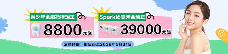 8800元起、成人金屬托槽矯正 12800元起、時代天使comfos隱形矯正 18800元起、美國Spark臻美聯合矯正