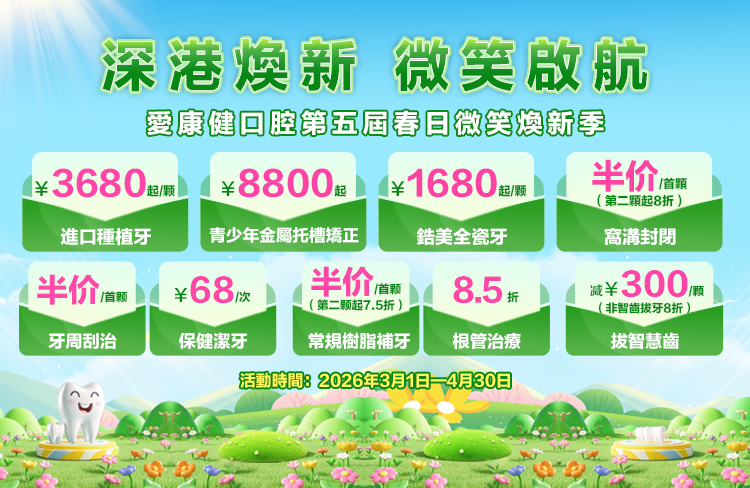 春節將至|愛康健口腔恭祝大家馬年吉祥,結合實際現公布深圳愛康健口腔醫院及12間愛康健齒科連鎖門診放假安排:2月16日-18日停診,2月19日部分門店開診,2月20日門店基本恢復正常!大家合理安排看診時間不便之處,敬請諒解!假期中,如遇牙痛或外傷,請及時聯系急診服務,感謝您一年的支持!願您新春快樂,享受美食時不忘口腔護理!愛康健價錢:保健洗牙68元,常規樹脂補牙首顆半價,進口植牙3680元起/顆,美白牙齒980元/顆,格萊美全瓷牙2580元/顆,E·max瓷貼面1980元/顆!深圳洗牙幾多錢,愛康健,深圳拔牙補牙多少錢,深圳種植牙價錢,愛康健牙科,深圳箍牙多少錢