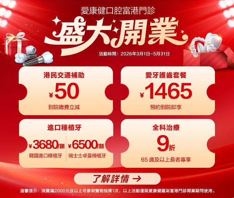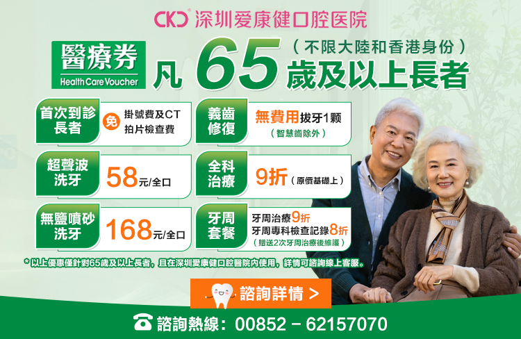2024年8月14日起,香港長者可使用醫療券在深圳愛康健口腔醫院支付牙科治療費用,長者醫療券適用於種植牙,洗牙,脫牙補牙,烤瓷牙,杜牙根,牙周治療,活動假牙,鑲配人造牙冠,鑲配假牙托,牙齒檢查,牙科放射照(CT 拍片/X光),覆檢假牙托/牙橋,長者洗牙補牙拔牙植牙可使用醫療券,香港長者醫療券,愛康健口腔醫院醫療券,香港醫療卷可以用嗎